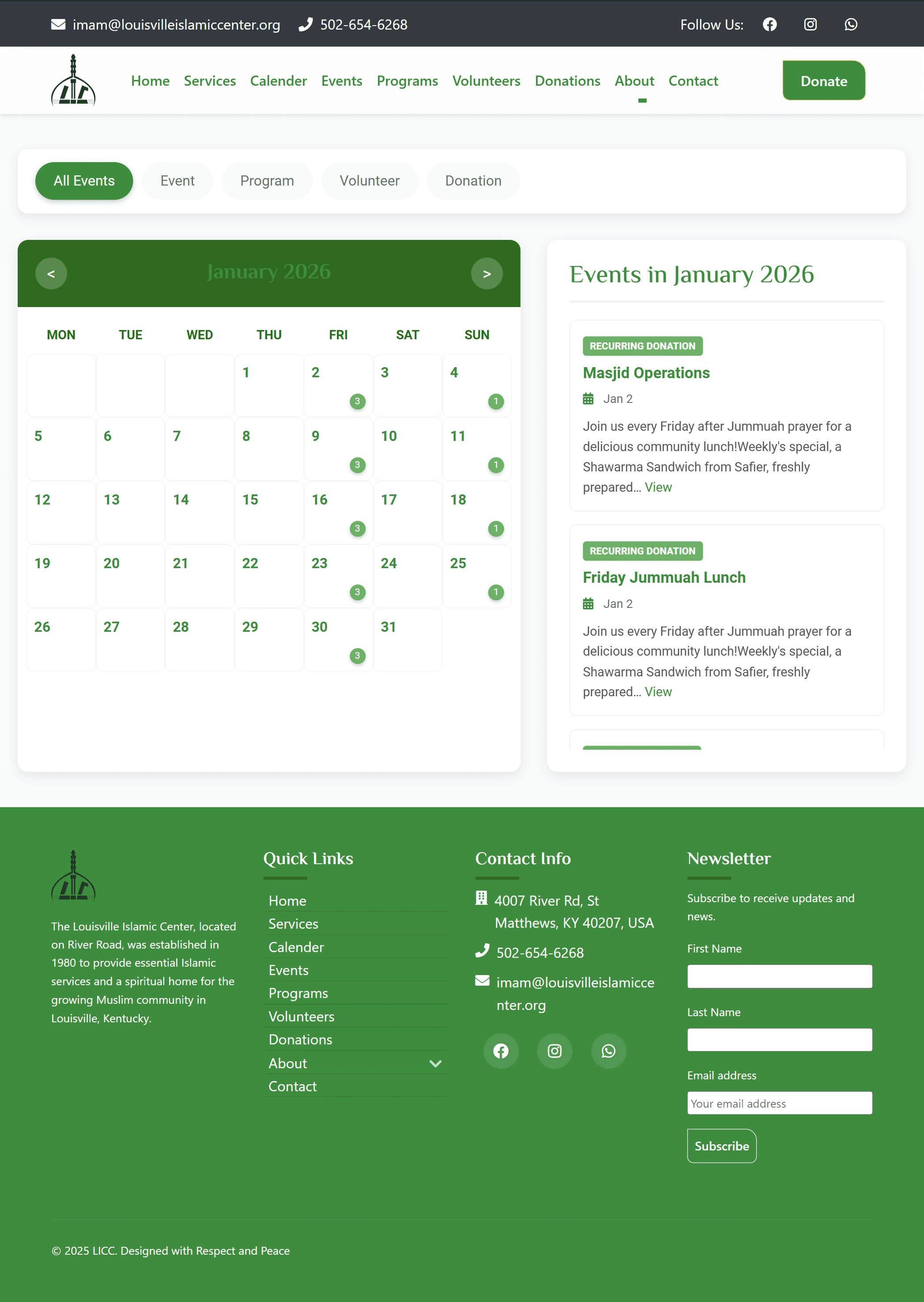 Designed and developed a custom WordPress theme currently active for the client Louisville Islamic Center (River Road Masjid), initially launched for the River Road Masjid to strengthen online community engagement and accessibility. The website acts as a centralized digital hub for the mosque, featuring dynamic posts across multiple categories, a calendar-based view for browsing events and programs, and support for recurring community initiatives.